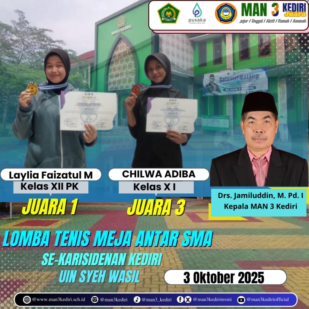Kab.Kediri (MAN 3) – Tiga siswi Madrasah Aliyah Negeri (MAN) 3 Kediri kembali mengukir prestasi gemilang dengan memborong gelar juara dalam dua cabang lomba bergengsi, yakni Tenis Meja dan Da’I ,Jum’at (3/10), pada ajang kompetisi se-Karesidenan Kediri. Kompetisi yang diselenggarakan oleh Universitas Islam Negeri (UIN) Syeh Wasil Kediri tersebut berlangsung secara maraton mulai tanggal 29 hingga 30 September, dan dilanjutkan babak final pada 1 Oktober 2025, membawa hasil yang sangat memuaskan bagi kontingen MAN 3 Kediri.