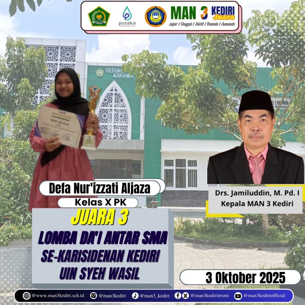 Tidak hanya unggul di bidang olahraga, “Tiga Srikandi” MAN 3 Kediri juga menunjukkan kekuatan di bidang keagamaan dan komunikasi. Defa Nur’izzati Aljaza, siswi Kelas X Program Keagamaan, berhasil meraih Juara 3 dalam Lomba Da’i antar SMA/Sederajat se-Karesidenan Kediri. Keberhasilan Defa di usia yang relatif muda menegaskan kualitas pendidikan MAN 3, yang tidak hanya fokus pada akademik dan olahraga, tetapi juga pada pengembangan bakat dakwah.