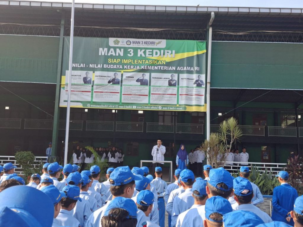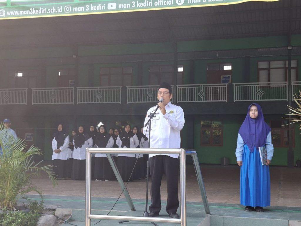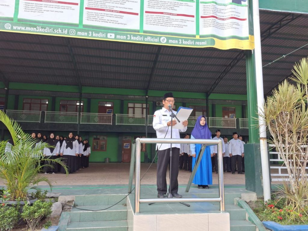 Kab.Kediri (MAN 3) – Madrasah Aliyah Negeri (MAN) 3 Kediri pagi ini, Senin (6/10) mengadakan apel bendera yang difokuskan pada penguatan karakter dan etika siswa. Seluruh jajaran Guru dan Tenaga Kependidikan bersama siswa kelas X dan XII memadati lapangan upacara. Apel hari ini tampak berbeda dari biasanya, sebab siswa kelas XI tidak turut hadir karena sedang mempersiapkan diri untuk kegiatan Rihlah dan Tadabbur Alam yang akan dilaksanakan keesokan harinya, Selasa (6/10).