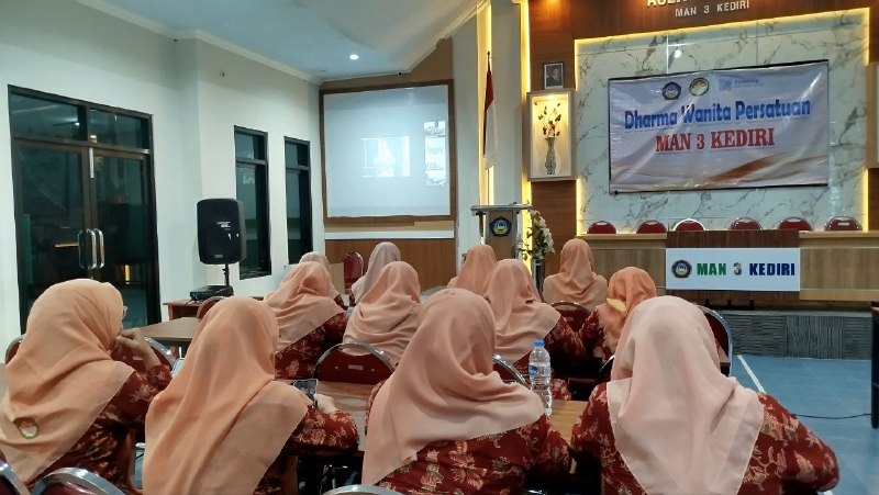 Kab. Kediri (MAN 3) – Seluruh pengurus dan anggota Dharma Wanita Persatuan (DWP) MAN 3 Kediri mengikuti agenda besar yang diselenggarakan oleh DWP Kanwil Kementerian Agama Provinsi Jawa Timur secara daring melalui Zoom Meeting pada Kamis (16/4). Bertempat di Aula Atas madrasah, kegiatan dimulai pukul 08.00 WIB dengan mengusung tiga agenda utama sekaligus: Sosialisasi Program Bunda Inklusi, Halalbihalal 1447 H, dan Peringatan Hari Kartini. Acara berlangsung khidmat, diawali dengan pembacaan ayat suci Al-Qur’an serta lagu kebangsaan Indonesia Raya.